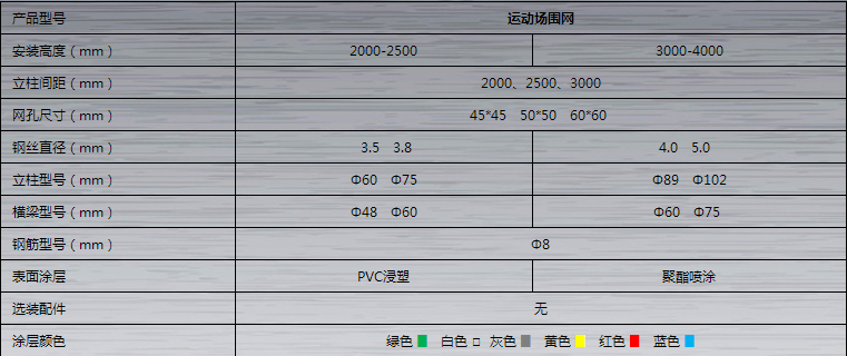 體育場圍網(wǎng)具有防腐、防老化、抗曬、耐候、色彩鮮亮、網(wǎng)面平整,強力張緊,不易受外力撞擊變形、現(xiàn)場施工安裝、靈活性強(可根據(jù)現(xiàn)場要求隨時調(diào)整造型和尺寸)的有點??蛇x顏色:藍色、綠色、黃色、白色等。