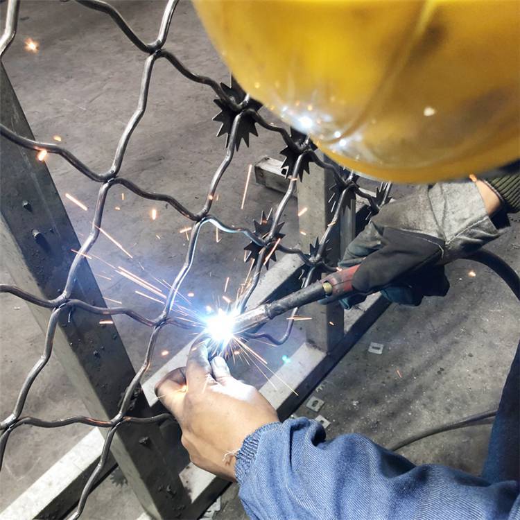 1、太陽花刺片:太陽花刺片直徑一般不小于7.5cm (直徑6cm、7cm、8cm) , 刺片厚1.5mm,采用Q235低碳鋼板沖壓成型。太陽花剌片用氬弧焊將太陽花形刺片焊接在美格網的節點上,形成刺形保護,有效的防止了手握腳攀。