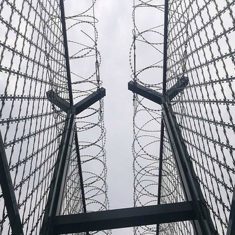 監(jiān)獄鋼網(wǎng)墻(監(jiān)獄圍墻網(wǎng))技術(shù)要求:監(jiān)獄鋼網(wǎng)是一種新型鋼網(wǎng) ,技術(shù)要求較高、隔離防護效果要強、不能翻越。通常采用銳利尖角鍍鋅鋼板或不銹鋼薄板做刀片,鋼絲做芯線組合而成的防護器材該產(chǎn)品具有嚇阻、防翻越等效果,材質(zhì)堅硬,高強度,高張力,造型設(shè)計獨特,不宜觸摸,因而能達到極好的防護隔離效果。還具有施工簡便,經(jīng)濟實用等優(yōu)點。1.監(jiān)獄鋼網(wǎng)墻(監(jiān)獄圍墻網(wǎng))采用方管,角鋼,刀片剌網(wǎng),鋼板網(wǎng)等鐵件采用熱鍍鋅,鍍鋅量不小于220克/m2 ,后加PVC浸塑處理,塑層厚 度0.38mm ,浸塑顏色為黑色.2.監(jiān)獄鋼網(wǎng)墻(監(jiān)獄圍墻網(wǎng))蛇腹型刀剌網(wǎng)采用熱鍍鋅加噴塑(雙層防腐)塑層厚度0.2mm.3.連接件采用螺栓熱鍍。4.門規(guī)格一般為: 1000*2000平開門。