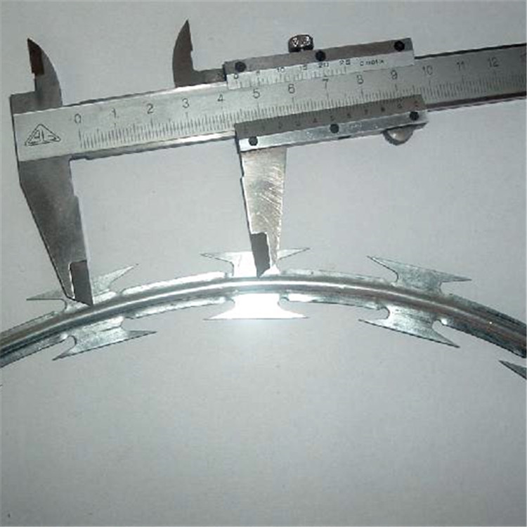它是用不同材質(zhì)的鋼板與不同材質(zhì)的絲兩種原材料組合而成,先把所需材質(zhì)的鋼板沖壓出刀片的尖刀直條,在和所需材質(zhì)的絲包裹在一起,在制作出我們所需要的圈直徑即可,刀異常的鋒利,只要觸摸到就會(huì)被刺傷,不可能讓非法分子有攀爬翻越的機(jī)會(huì),是現(xiàn)代社會(huì)各場(chǎng)所圍墻安裝的最佳防護(hù)隔離網(wǎng)。