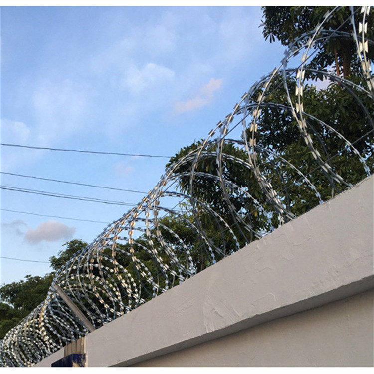 它是用不同材質的鋼板與不同材質的絲兩種原材料組合而成,先把所需材質的鋼板沖壓出刀片的尖刀直條,在和所需材質的絲包裹在一起,在制作出我們所需要的圈直徑即可,刀異常的鋒利,只要觸摸到就會被刺傷,不可能讓非法分子有攀爬翻越的機會,是現代社會各場所圍墻安裝的最佳防護隔離網。