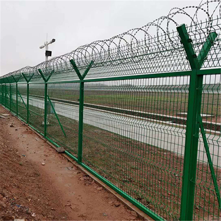 機場圍界網面是由直徑5毫米的鋼筋排列成矩形網格點焊形成,相鄰橫筋間距不大于10厘米,相鄰豎筋間距不大于5厘米。每片鋼筋網片寬度不大于3M,用螺栓固定在事先埋設好的立柱上,為增加圍界的穩定性,一般每30米左右增加一個斜撐圍界上部50- -60cm以30-40度角向外傾斜或設置滾筒形刺鐵絲網防止攀越。