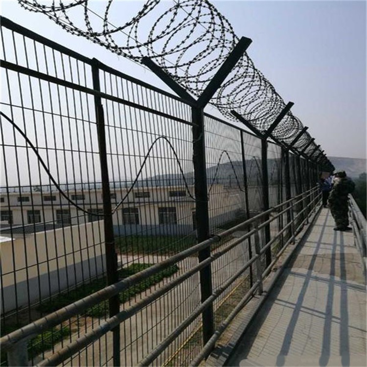 監獄鋼網墻立柱的頂部焊接V型支架(這種立柱也叫做Y型立柱) ,用來架設蛇腹形刀刺網,與下方的監獄鋼網墻完美結合,形成一道難以逾越的銅